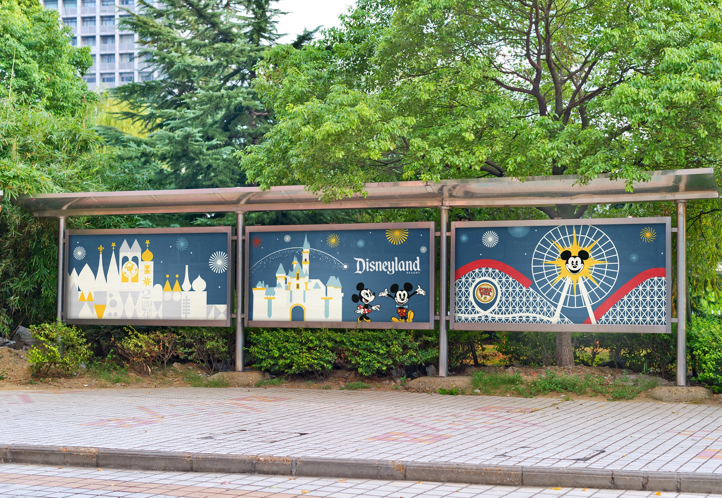 I designed a series of stylized illustrations based on iconic park elements — It’s a Small World, Sleeping Beauty Castle, Pixar Pal-A-Round, and fireworks — using a cohesive mid-century-inspired aesthetic. The system was built to scale across ticketing, signage, and environmental graphics, allowing the resort to maintain a consistent visual presence between seasonal campaigns.