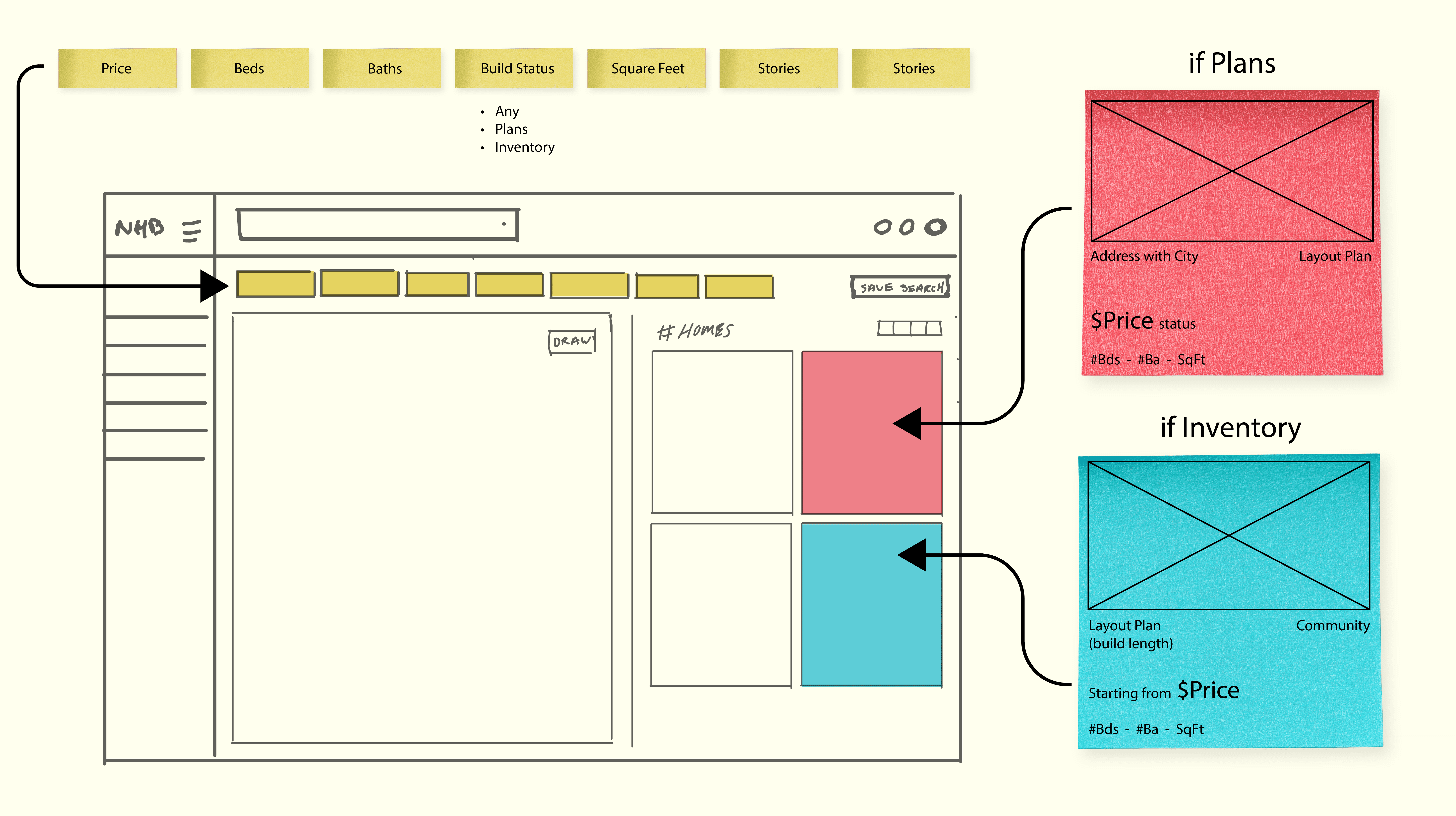 Problem: The platform needed to support two different search behaviors — browsing general floor plans and viewing specific homes for sale — without confusing users or overloading the interface.