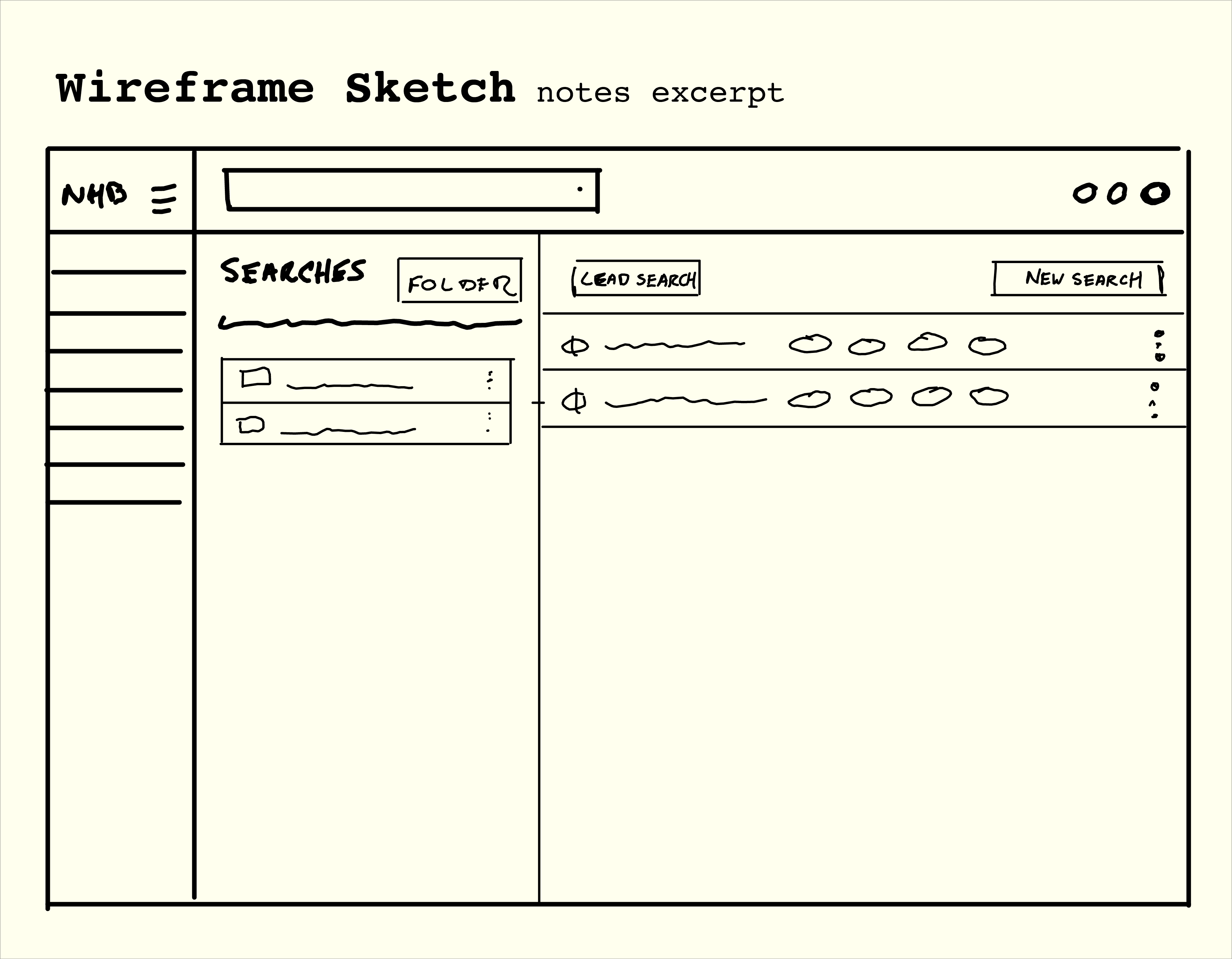 Top-Left: User flow for creating and saving searches Top-Right: Wireframe of the lead gen page where searches are saved Bottom: Hi Fi recording of process