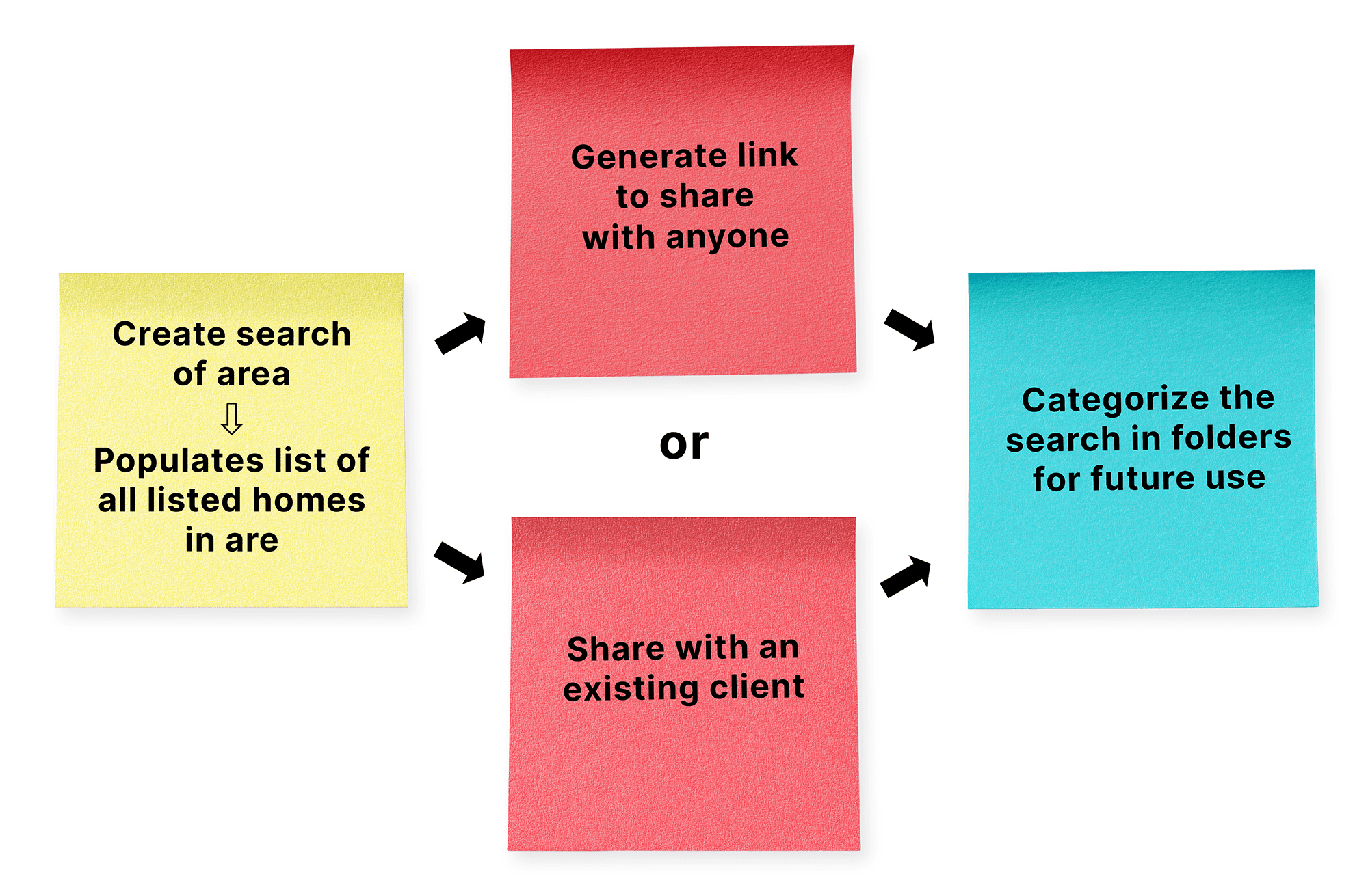 Approach: I designed a saved-search system that allowed users to apply location and filter criteria, generate shareable links, and organize searches into labeled folders. The interface supported sending results directly to clients or posting them publicly as lead-generation content.